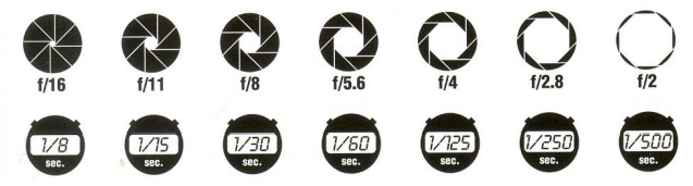 동일한 상황에서 Shutter Speed, Aperture를 조절하면 서로 다른 이미지를 얻을 수 있지만, 전체적인 Exposure 양은 수치적으로 조절을 하면 같게 만들 수 있다. 따라서, 내가 찍고자 하는 상황은 동일한 Exposure에 대하여 서로 다른 이미지 결과를 얻을 수 있다는 의미이다. 동일한 빛의 양에 따른 Shutter Speed 와 Aperture의 조합은 아래와 같다.