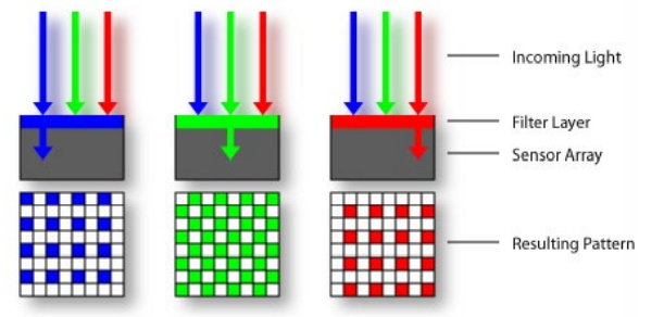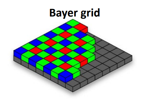 빛은 Sensor를 통해 광량으로 빛의 Intensity 정보를 가져온다. 이때, 각 칼라 필터는 특정한 색의 Intensity를 추출하는데, 이러한 격자 형태를 Bayer Grid(Pattern)이라 한다. 각 필터는 실제로 우리가 잘 아는 R,G,B의 색을 추출함을 알 수 있다.