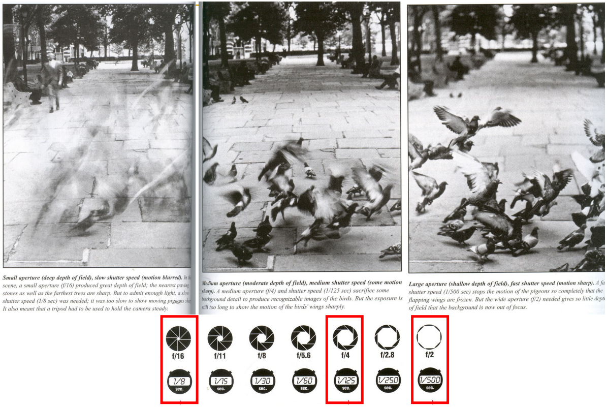 반면, Shutter Speed를 높이면 빛의 양을 많이 받지만 움직이는 객체에 대하여 잔상이 생긴다. 동시에, f 값을 키워 Aperture를 낮추면 심도가 깊어지지만, 받는 빛의 양은 감소한다.