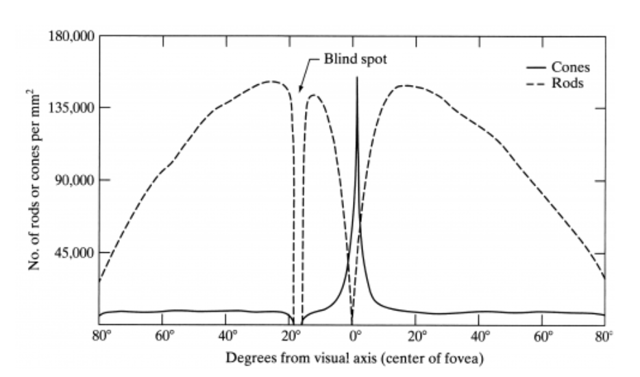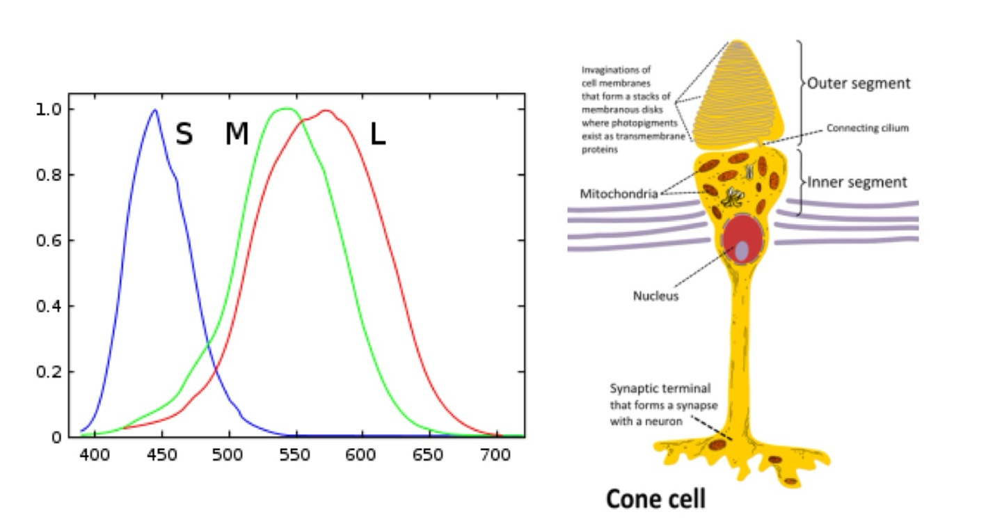 실제로 사람의 눈에서 일어나는 인식 과정은 Fovea(중심와)에 빛이 들어와 초점이 맺힘으로써 진행된다. 이때, 색상을 인식하는 세포는 크게 원추 세포(Cone Cell)와 간상 세포(Road Cell)로 구분된다.