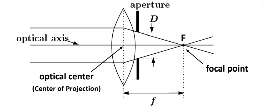 해당 수식에서 $f$는 초점 거리, $z_i$는 상이 맺히는 지점, $z_o$는 물체와의 거리를 의미한다. 즉, $z_o, f$를 알고 있다면 $z_i$를 계산할 수 있다. 핀 홀 모델에서는 $f=z_i$이고, 렌즈 모델에서는 수식에 근거하여 동일하게 만들 수 있으므로 렌즈 모델 대신 핀 홀 모델을 사용해도 무방함을 알 수 있다.