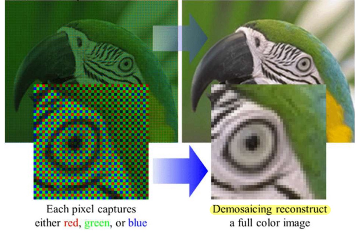 하지만, 각 Grid의 필터는 특정한 한 색의 Intensity 밖에 받아들이지 못한다. 하지만 하나의 색상을 결정하는 요소는 R,G,B로 이루어져 있다. 따라서 주변의 RGB Value를 이용해 평균값으로 자신의 RGB을 추정하는 것을 Demosaicing이라 한다.