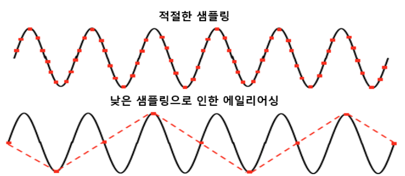 원본 신호가 있고 이를 적절하게 샘플링 한다면 위 그림처럼 원보 신호를 정상적으로 복원할 수 있다. 하지만 샘플링 주기가 길어 낮은 샘플링이 진행된다면 원본 신호를 정상적으로 복원하지 못한다.