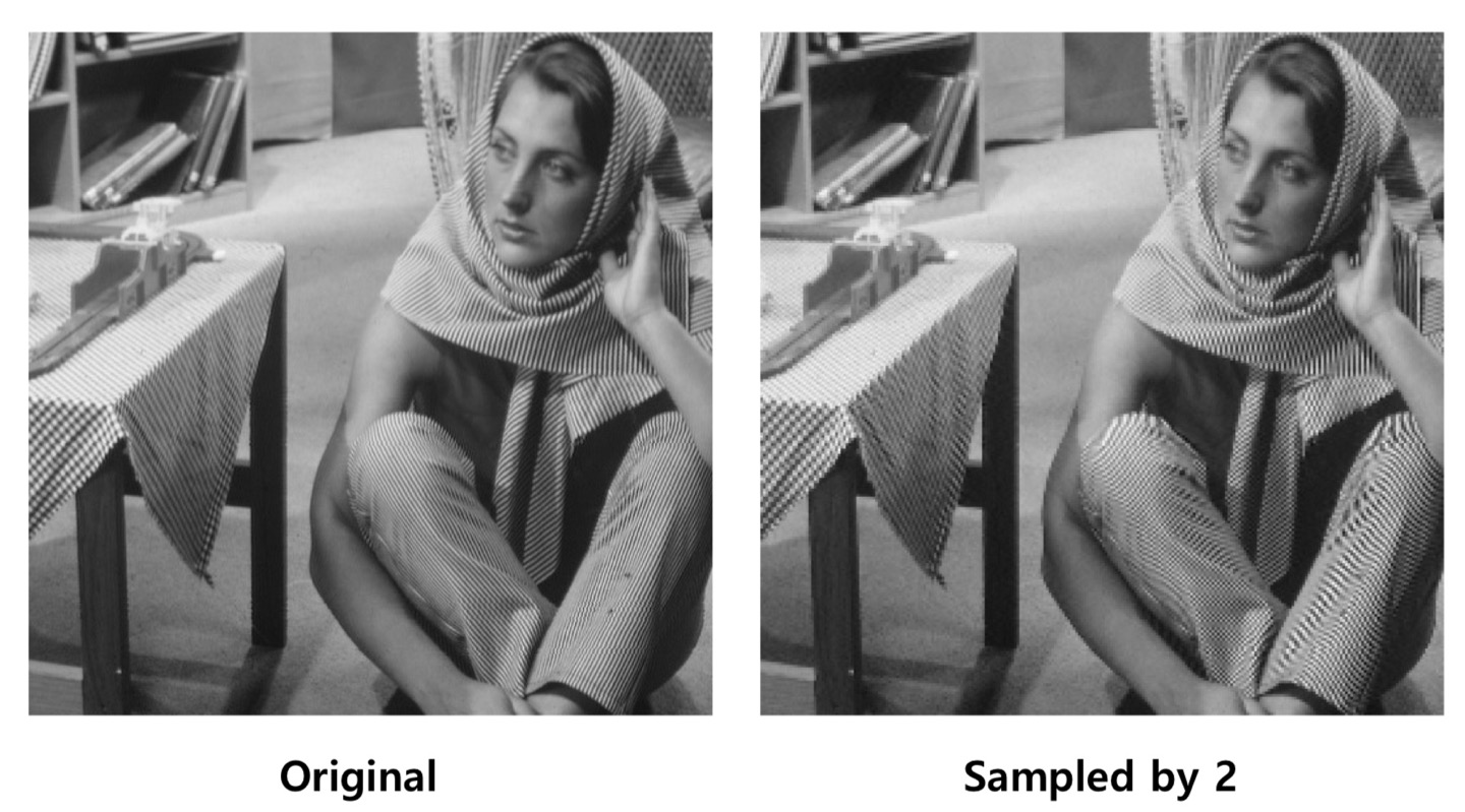 위 과정처럼 Down Sampling을 진행한다고 생각 해 보자. 왼쪽의 Original Image로 부터 Sampled by 2가 진행되면, 4개의 픽셀에 대하여 젤 왼쪽 위의 값이 나머지의 픽셀의 값을 대표한다고 생각하면 된다. 하지만 지나친 Down Sampling은 몇가지 문재를 야기할 수 있다.