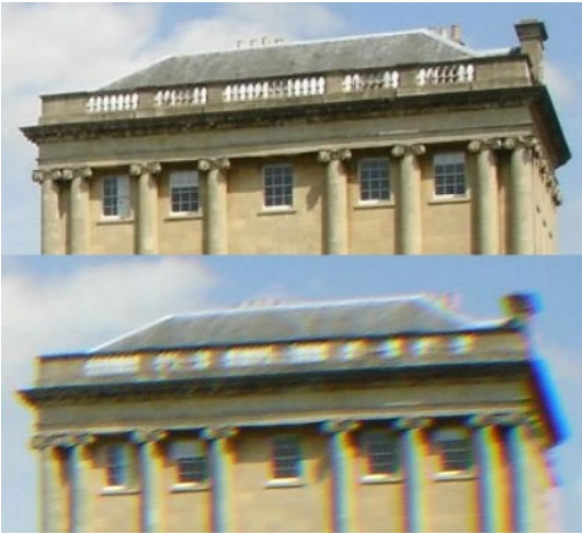 색의 파장에 따라 굴절률이 다르기 때문에 빛이 한 점에서 모이지 않아 이미지가 흐릿해 지는 현상이다.