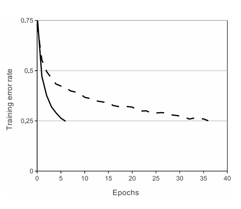 위 그래프를 통해 ReLU가 tanh보다 학습 속도가 훨씬 빠름을 알 수 있다. 이는 큰 규모의 데이터셋에서 훈련 모델의 성능에 좋은 영향을 미칠 수 있다.