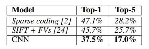 ImageNet LSVRC-2010에서 120만 개의 고해상도 이미지가 1000가지 클래스로 이루어진 Dataset을 Calssification 하기 위해 Large, Deep Convolution Neural Network(DCNN) 학습시켜, test dataset에 대한 37.5%의 Top-1 Error와 17.0%의 Top-5 Error를 달성하여 이전의 SOTA(State-Of-The-Art)보다 우수한 성능을 보였다.