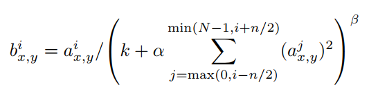 따라서 이를 해결하고 아래 식을 통해 측면억제(later inhibition)을 구현하였다. 이때, a는 x,y 위치에 적용된 i번째 kernel의 output을 의미하고, 이 a를 normalization하여 큰 값이 주변의 약한 값에 영향을 주는 것을 최소화 하였다.