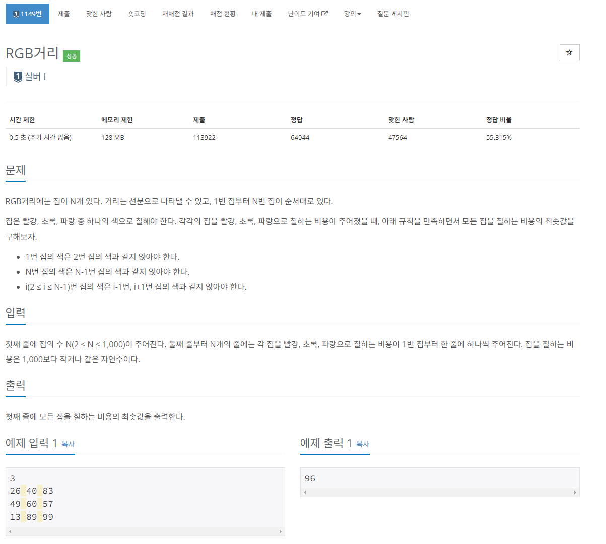 따라서 각각의 색상에 따른 최소비용을 매번 계산한 후 최종적으로 가장 비용이 적은 것을 선택하면 된다.