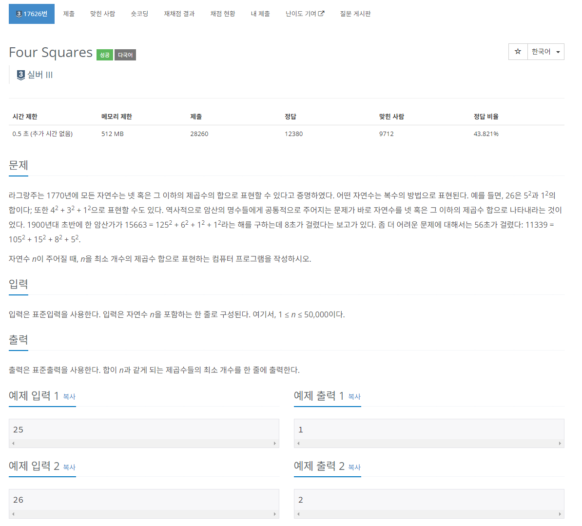 23의 경우 위 논리데로 수행하면 DP[23] = DP[7] + 1, DP[7] = DP[3] + 1 = 4이므로 DP[23]은 5이 된다. 이는 넷 혹은 그 이하의 자연수의 제곱의 합으로 표현할 수 없다.