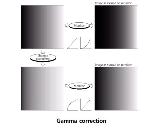 실제 영상 밝기를 왼쪽 상단 처럼 선형적이라고 하자. 하지만 모니터는 오른쪽 상단처럼 비선형적으로 밝기가 증가하고 우리는 이를 알고 있다. 따라서 모니터 밝기와 반대로 비선형적으로 증가하는 Input(지수 함수)을 줌으로써 최종 Output이 선형적으로 되도록 하는 방법이다. 해당 지수함수는 하드웨어적인 환경에 따라 $\gamma$값을 변형시켜 적용하면 된다.