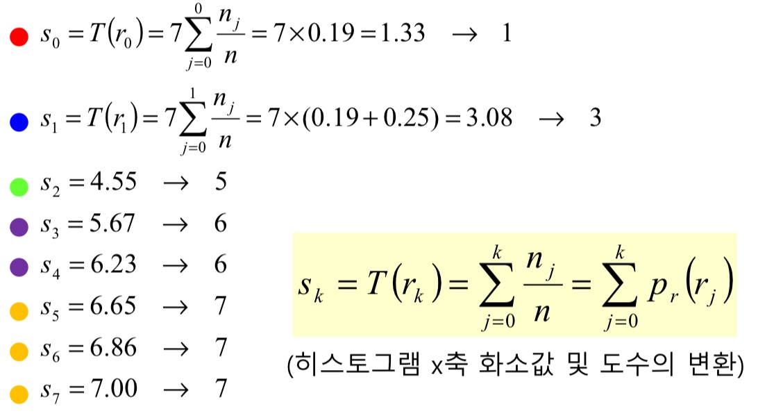 단순히 누적 이기 때문에, $T(r_0) = 0.19, T(r_1) = 0.19+0.25=0.44$, /cdots$이다. 확률이기 때문에 결국 누적합은 1이 된다. 하지만 이를 다시 매핑하여 $s_k$를 구하는 과정에서 누적 확률에 7을 곱하는 것을 확인할 수 있다. 이는 0~1의 누적확률에서 7을 곱해서 0~7의 Intensity를 나타내는 Histogram Domain으로 변환시킬 수 있기 때문이다.