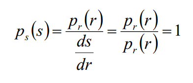 CDF, PDF는 위의 관계를 같기 때문에 CDF가 $T(r)$이 되고, PDF가 $p_r(r)$ 원래의 확률 밀도 함수가 된다면 결국 $p_s(s) = 1$을 만족할 수 있게 된다. 이를 수식적으로 표현하면 다음과 같다.