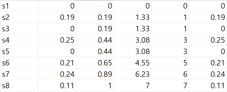 한번 더 반복하면 더 잘 될 것 같지만, 결국 결과는 동일하다. 2열은 현재 확률, 3열은 누적 확률, 4열은 7을 곱한 결과 5열은 Histogram Domain으로 옮긴 결과, 6열은 최종적으로 Histogram Equalization을 한 결과 각각의 확률 값이다. 결국 동일하다.