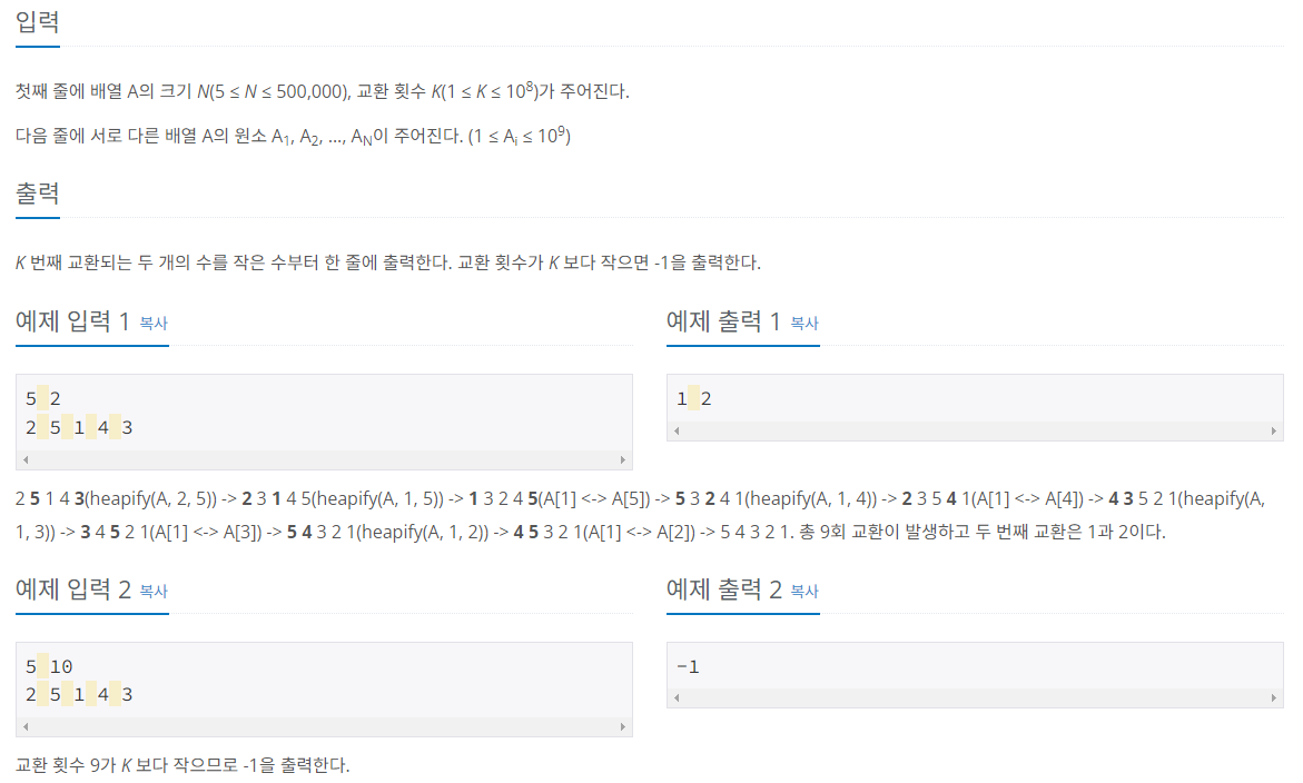 [ 정렬 - 24173 ] 알고리즘 수업 - 힙 정렬 1(C++) 본문