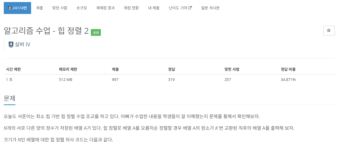 [ 정렬 - 24174 ] 알고리즘 수업 - 힙 정렬 2(C++) 본문