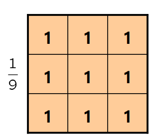 가장 기본이 되는 Box Filter는 오른쪽 3x3 Filter와 같이 인접 픽셀의 Intensity 평균값을 각 픽셀의 Intensity로 만들어 주는 Filter로, Smoothing Effect를 일으킨다. Smoothing Effect는 Noise를 감소시는 이점이 있지만 더 좋은 Filter가 있기때문에 주로 사용되지는 않는다.