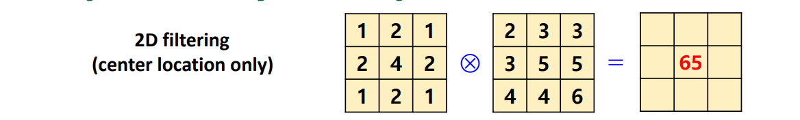 2D Correlation은 2D Convolution과 큰 차이가 없다. 하지만 $f[x+k,y+l]$이기 때문에 filter $g$가 뒤집히지 않음을 확인할 수 있다. 따라서 Image Filtering에서는 위와 같은 방식으로 Filtering을 진행하게 된다.