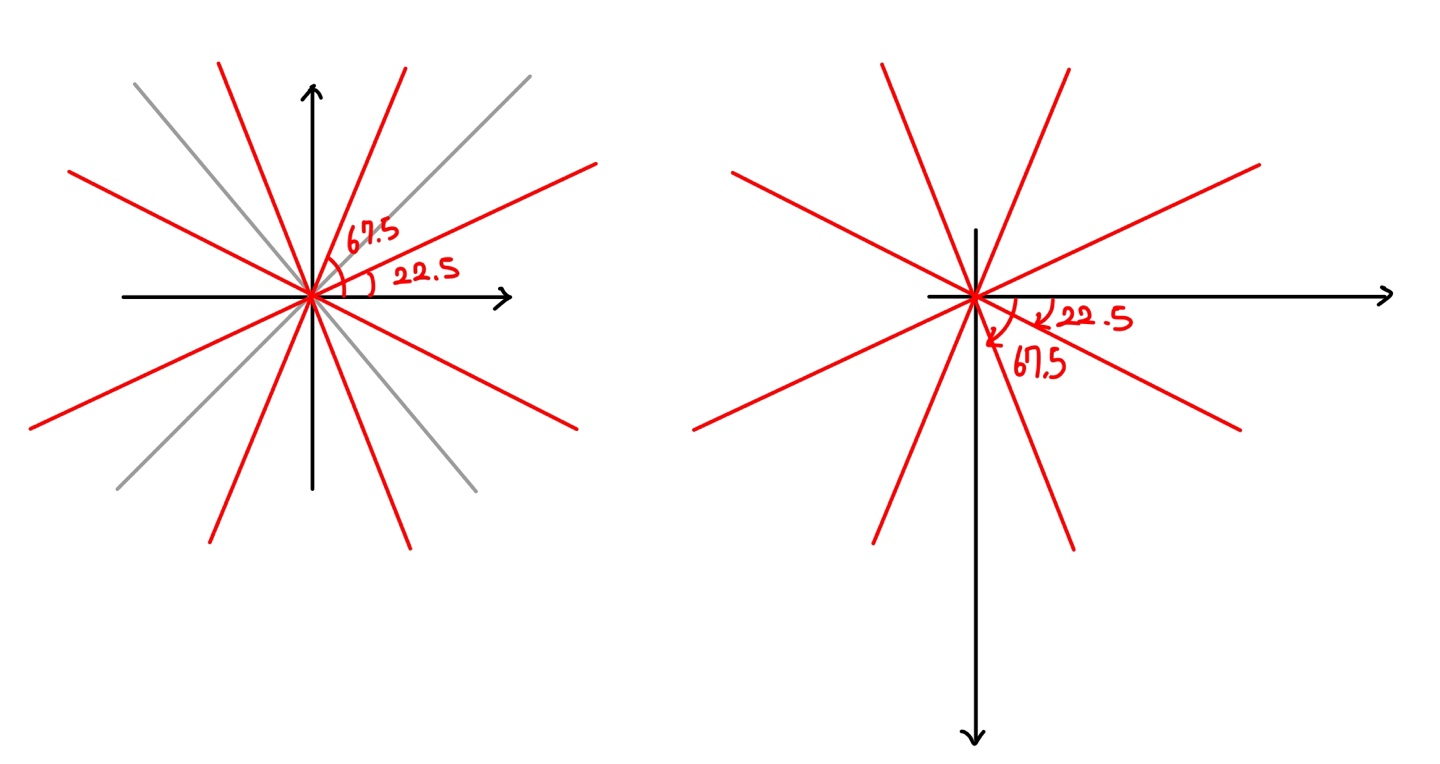 각 방향에 대하여 NMS를 적용할 때, Canny의 경우 Direction을 크게 4 부분으로 나눈다. 이때, 픽셀 좌표계는 월드 좌표계와 달리 오른쪽 처럼 형성되었기 때문에 22.5~67.5의 범위가 아래와 같이 형성됨을 주의하자.