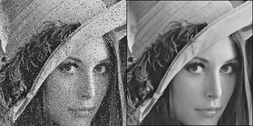 결과는 다음과 같다. 현재 가장자리 문제를 해결하기 위해서 해당 부분을 접근하지 않았기 때문에 테두리가 검은색(Intenstiy = 0)임을 확인할 수 있다. 또한, 이미지 내부의 Salt and Pepper Noise가 제거됨을 확인할 수 있다.
