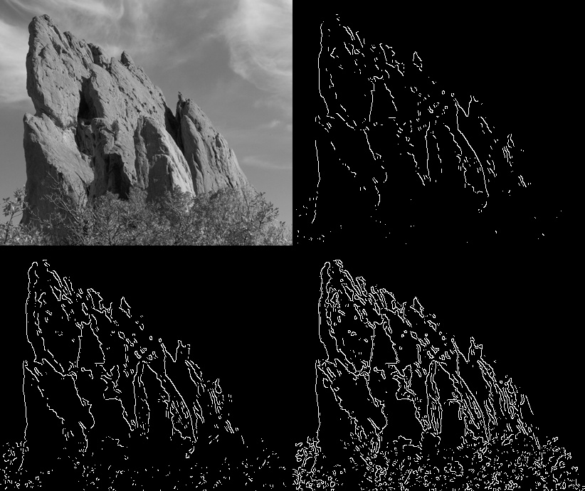 오른쪽 상단은 $T_{min} = 100, T_{max} = 200$, 왼쪽 하단은 $T_{min} = 100, T_{max} = 150$이다. $ T_{max}$가 작아질수록 Gradient Magnitude가 작은 Edge도 Edge라고 판단한다. 오른쪽 하단은 $T_{min} = 100, T_{max} = 50$ $인데, T_{max}$가 작아지니 이전엔 Edge가 아니라고 Fitering 된 Edge들도 검출되는 것을 확인할 수 있다.