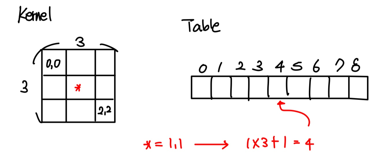 따라서 table은 1x9 형태의 Vector 처럼 존재할 것이고, 접근하는 방법은 Mat::data를 통해 접근하는 것 처럼 $[ (Kernel Width) * (접근하고자 하는 열) + 접근하고자 하는 행]$으로 접근하면 된다.