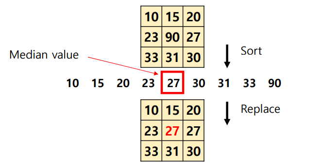 // Kernel 내의 Intensity의 Median을 찾는 과정 : 정렬 후 중심값