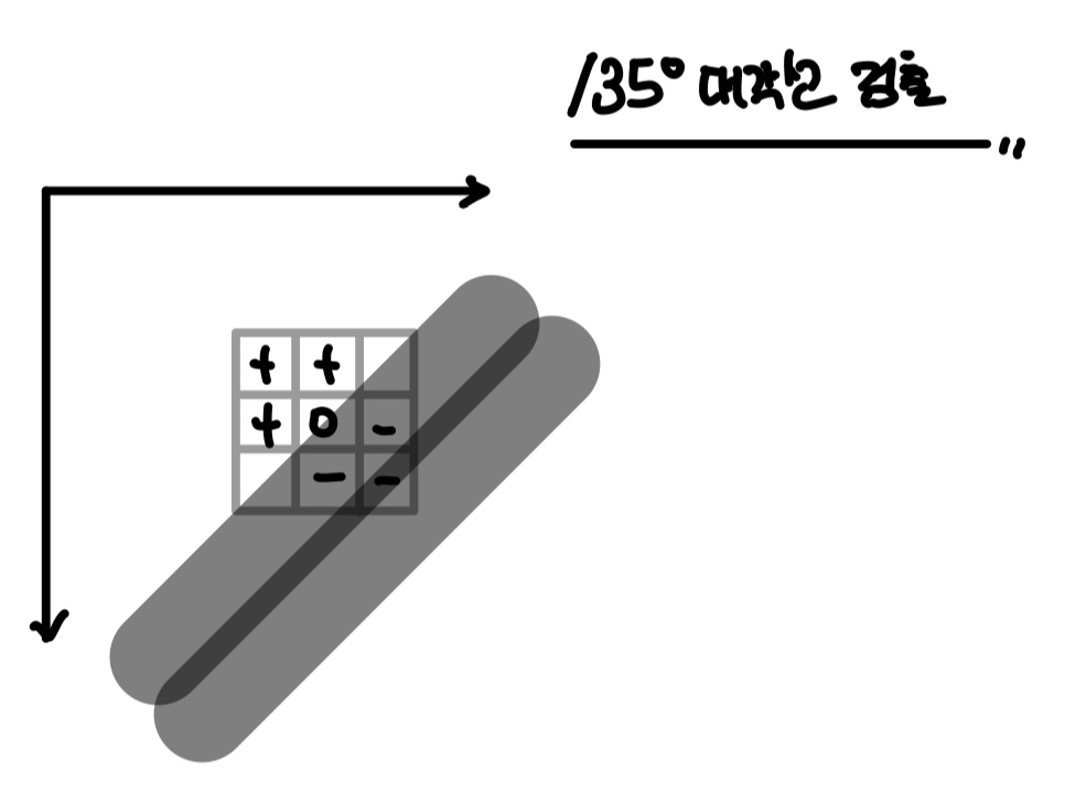 따라서 45, 135도 대각선 방향에 대한 Edge를 검출하기 위한 Filter는 위와 같이 만들 수 있다. 이때, 45, 135도의 대각선 방향을 이미지 좌표계를 고려하여 생각해야 함을 주의하자.