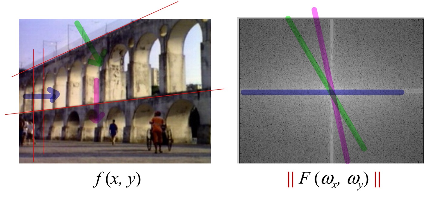 Magnitude를 분석 해 보면 기둥의 수직 Edge는 $w_x$의 고주파를 형성한다. 또한, 바닥에 발생되는 수평 Edge는 $w_y$의 고주파를 형성하게 된다. 대각으로 존재하는 고주파는 다리에서 발생되는 대각 Edge에 의한 결과이다.
