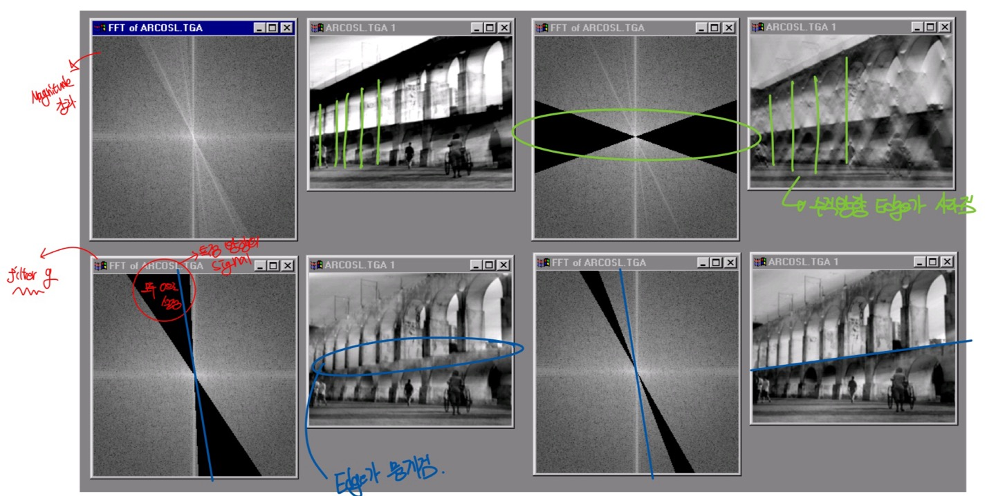 그렇다면 Frequency Domain에서 Specturm을 변경 해 보자. 왼쪽 상단은 Magnitude의 크기를 키운 결과 Edge 부분이 더 강하게 표현됨을 확인할 수 있다. 오른쪽 상단은 $w_x$를 모두 0으로 설정하였다. 즉, x축 방향으로의 밝기 변화를 없앴기 때문에, 다리의 수직 Edge가 모두 뭉게짐을 확인할 수 있다.