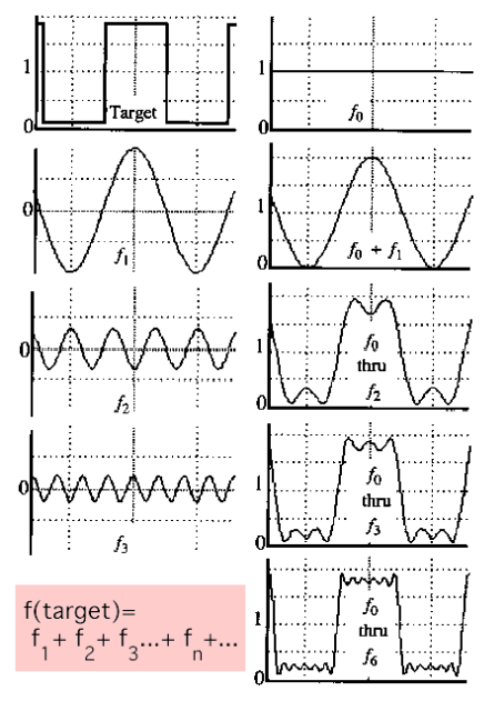 Unit Pulse도 일종의 주기함수인데, 오른쪽과 같이 서로 다른 sin, cos의 합으로 근사하여 표현될 수 있다. 이 과정에서 퓨리에 변환을 통해 매개변수는 $x$에서 $w$로 변하게 된다.