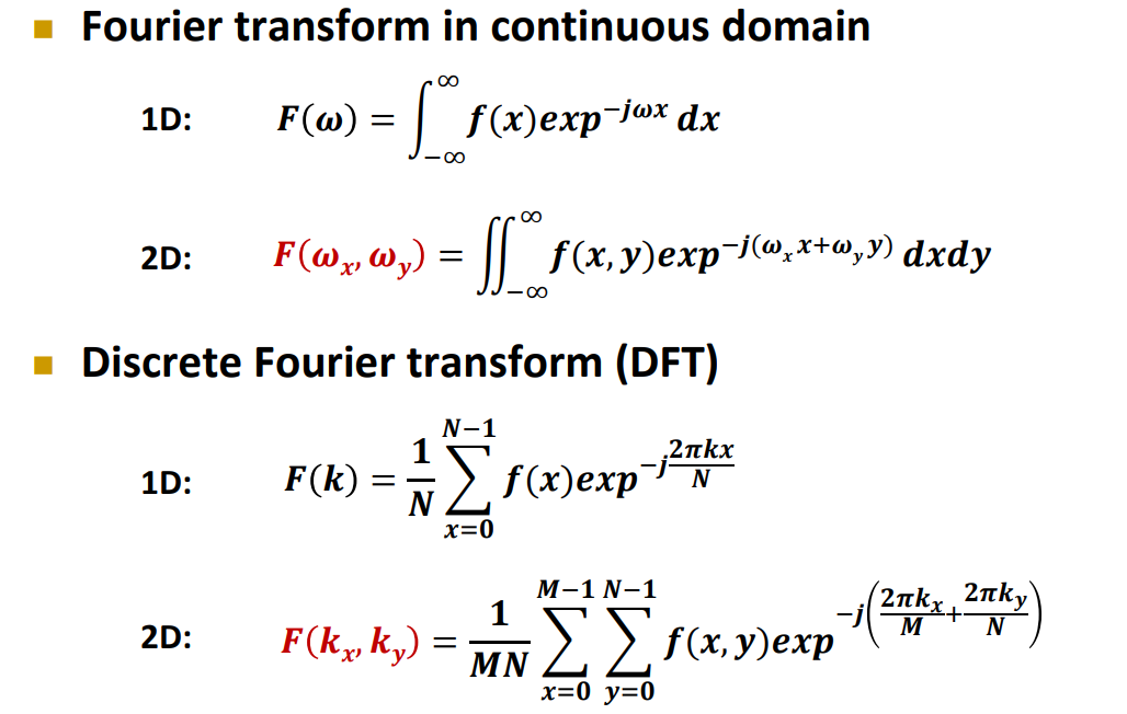 퓨리에 변환은 Continous한 도메인에서 위와 같이 정의된다. 하지만 영상의 경우 Discrete 하기 때문에 적분에서 시그마로 변환하여 아래와 같이 표현함을 알 수 있다.