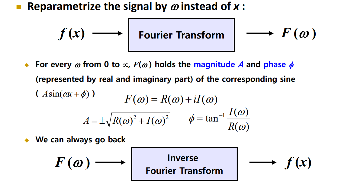 주파수 도메인의 $F(w)$는 Magnitude(크기) $A$와 Phase(각도) $\phi$로 구성된다. $F(w) = F(-w)$로 원점 대칭의 성질을 가지며, Inverse Fourier Transform 과정을 통해 원본 $f(x)$로 변환시킬 수 있다.