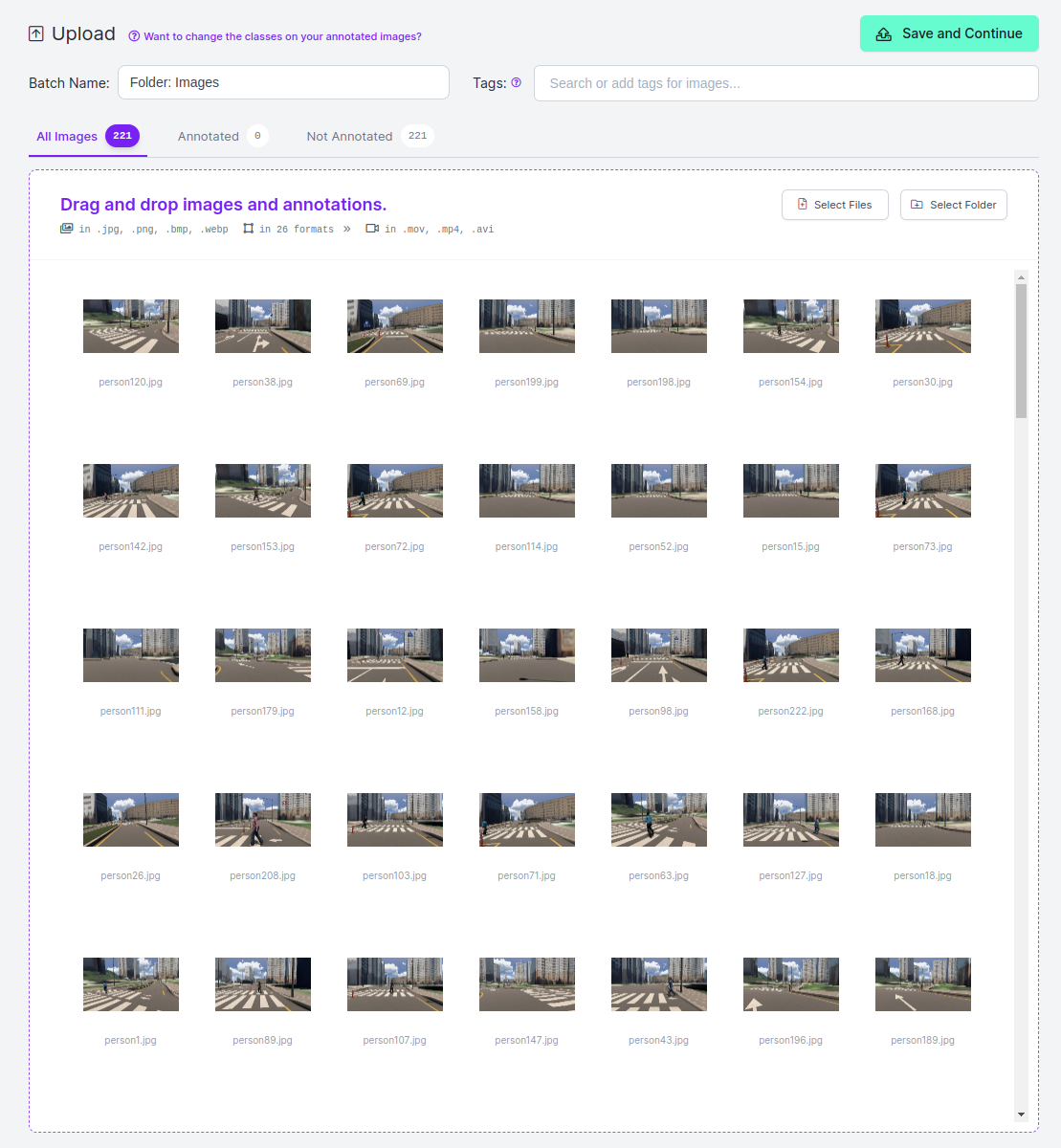 이후 학습시킬 Dataset을 Upload 한다. 추가적인 Dataset을 구축하기 위해서 프로젝트 생성 이후 추가적인 Image를 추가하는 것도 가능하다. 전부 Upload 완료 하였으면 Save and Continue.