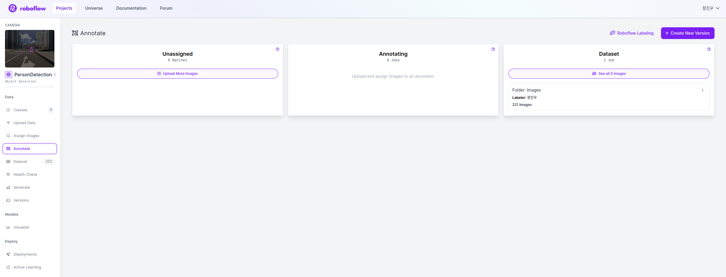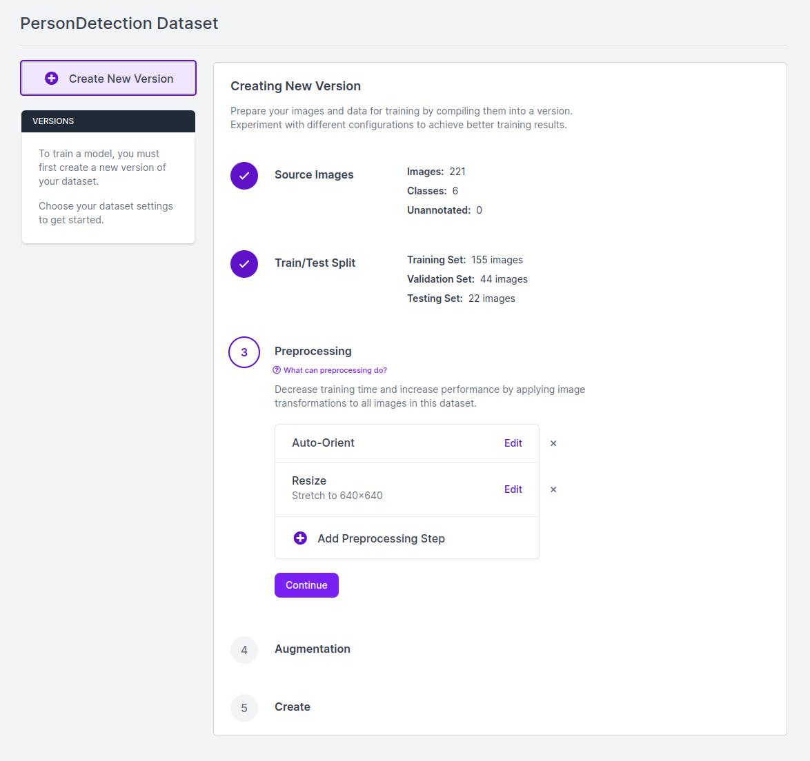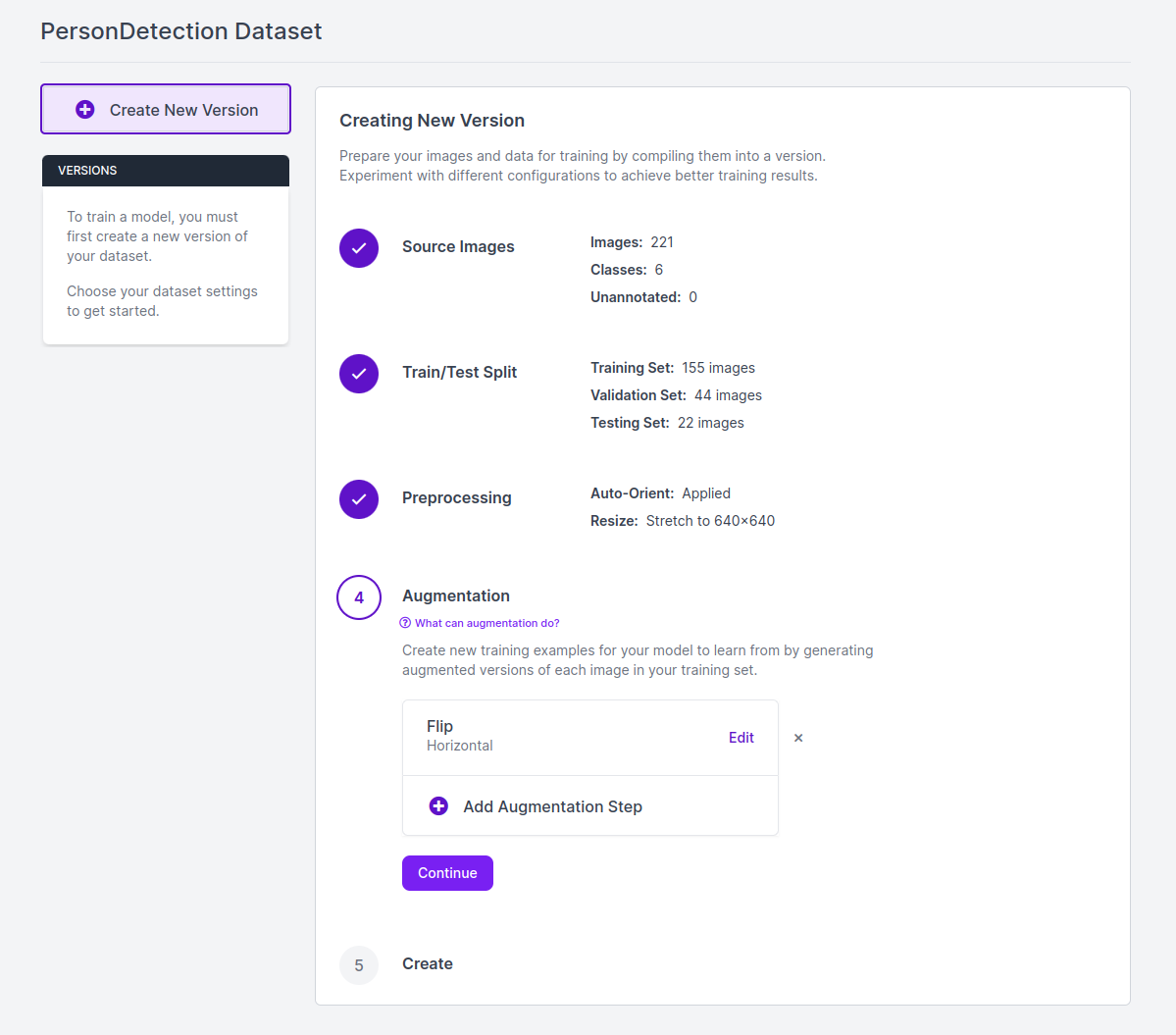 생성한 Custom Dataset을 기반으로 학습 Dataset 생성을 위해 우측 상단 Create New Version.