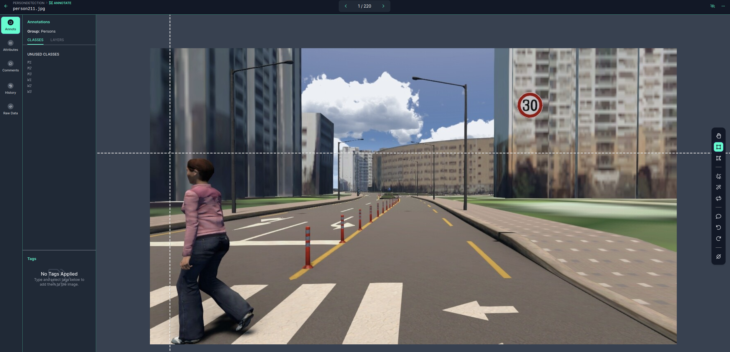 이제 Dataset에 대하여 Class에 맞는 객체의 Bounding Box를 생성하면 된다. 우측 세로 창의 두번째 버튼을 클릭하면 다음과 같이 흰색 격자선이 생성되고, 객체에 맞게 Bounding Box를 생성한 뒤 그에 맞는 Class를 선택하면 된다.