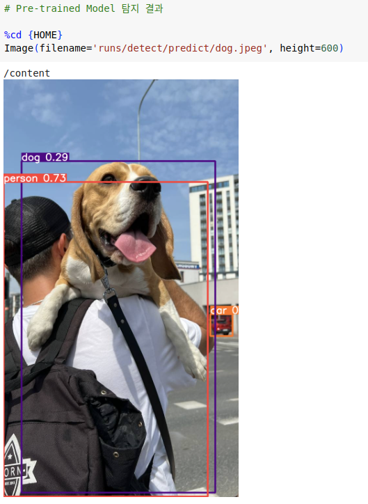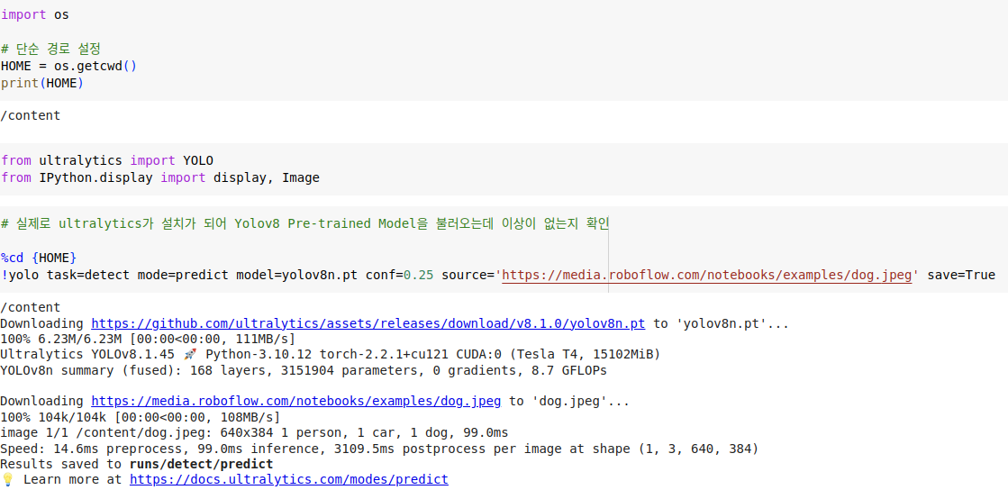 학습과 YOLOv8에 필요한 패키지를 import 한 뒤, pre-trained model을 불러와 정상적으로 동작하는 환경 설정이 다 되었는지 확인한다. 오른쪽과 같이 pre-trained model의 detection 결과가 잘 뜬다면 잘 설정 한 것이다.