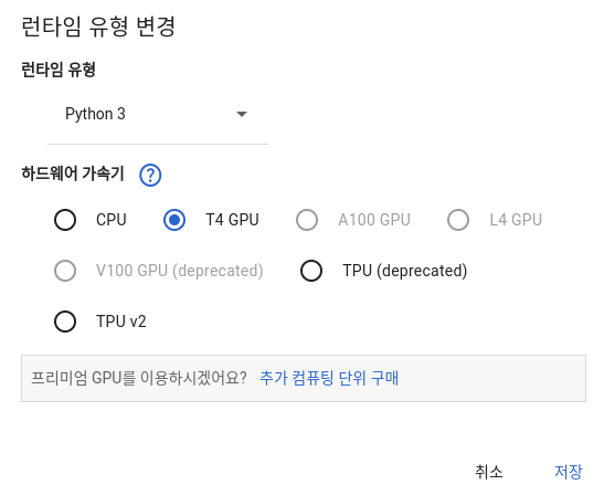 먼저 Colab 파일을 하나 생성한 뒤 GPU를 활용하도록 런타임 유형을 변경한다. !nvidia-smi를 통해 현재 그래픽 카드 버전을 확인한다(필수는 아님)