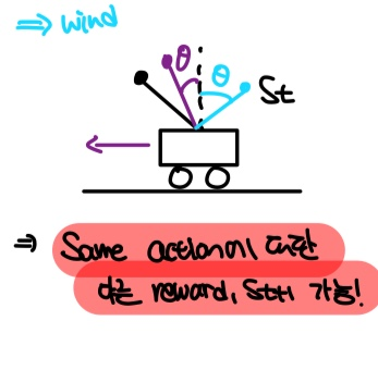 만약 바람이 왼쪽에서 오른쪽으로 분다고 가정하면 똫같은 $A_t$가 발생했다고 하더라도, 파란색 $\theta$로 표현된 것 처럼 다른 $s_{t+1}$이 발생될 수 있다.