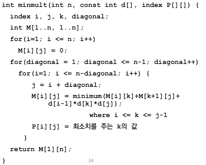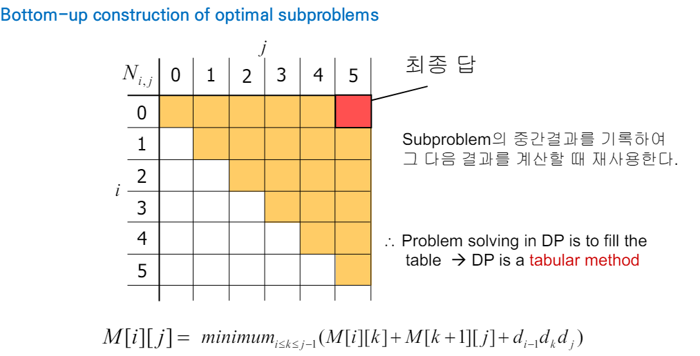 $$1 \leq i \leq j \leq n, M[i][j] = minimum_{ 1 \leq i \leq j \leq n }(M[i][k] + M[k+1][j] + d_{i-1}d_kd_j)$$
