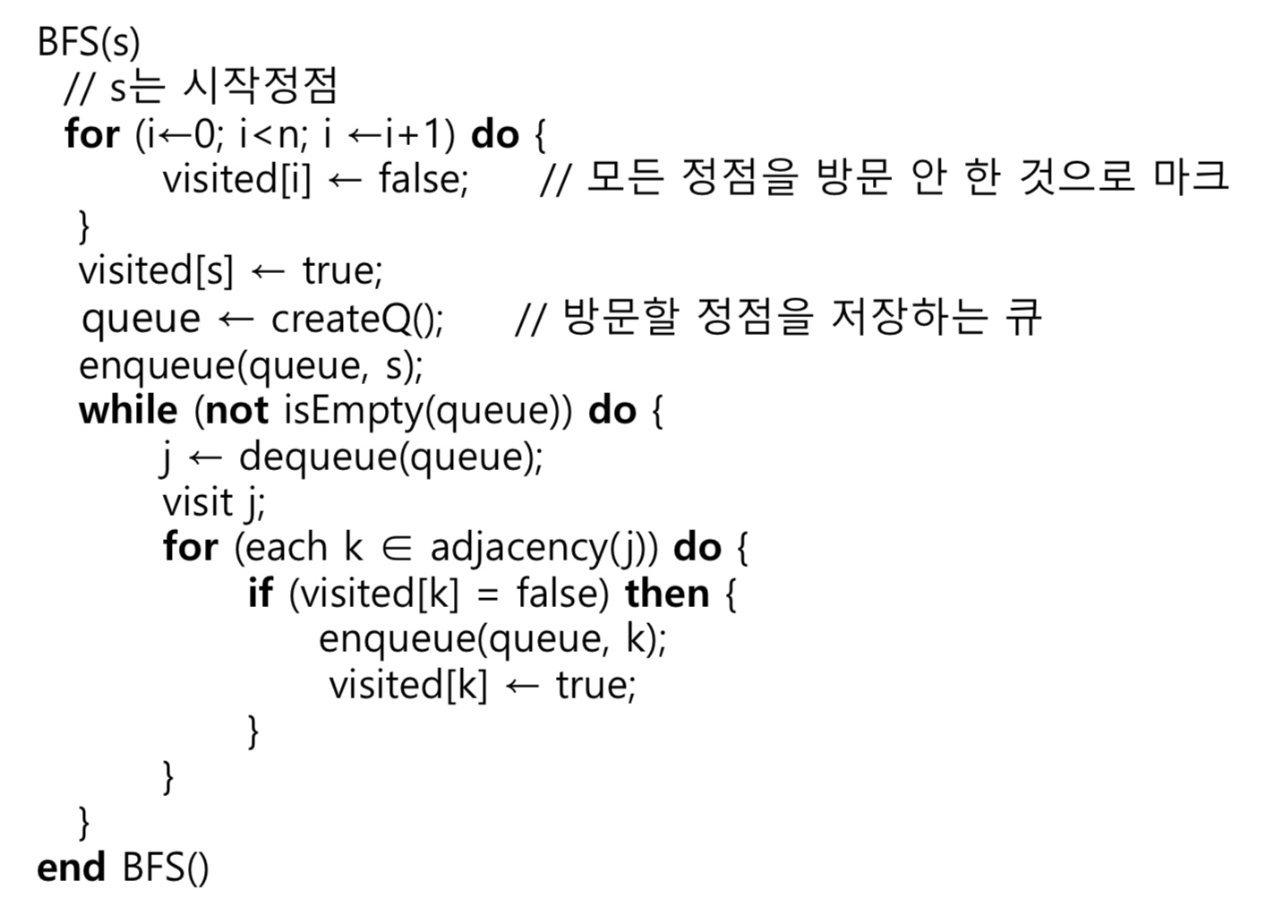 수도코드 기반으로 그대로 구현하면 된다. 3번 과정에서 Queue에 저장한 노드들에 대하여 단계 1을 반복하므로 while문으로 반복 중이며, 방문 여부는 visited 배열, 인접 노드는 Graph(2차원 배열)로 관리하면 된다.