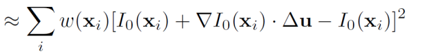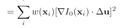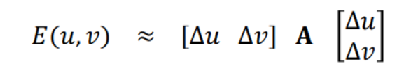 여기서 $\Delta u$는 Patch의 이동 Vector, $I$는 Intensity, $w(x_i)$는 Window Function으로 Patch 영역 내부를 의미한다. $x_i$는 특징점이라고 추정되는 좌표임을 고려하여 위 수식을 해석 해 보면, 특징점으로 추정되는 위치($x_i$)와, 해당 위치의 인접 픽셀로 이동한 위치($x_i + \Delta u$)에서의 Intensity Difference의 제곱을 계산한 것이 $E_{AC}(\Delta u)$이다.