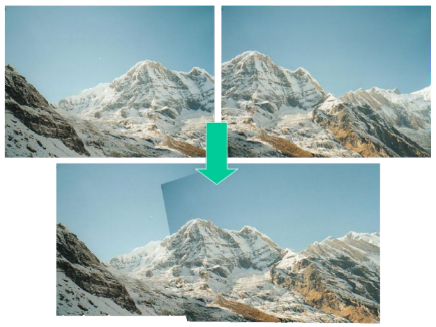 위 두 사진은 서로 다른 사진이지만, 겹치는 영역이 있다. 겹치는 영역에 대하여 각각의 사진에서 찾은 Local Feature는 각 사진에서 Unique하다. 따라서 같은 Local Feature를 Matching시킨다면, 오른쪽과 같이 더 넓은 화각을 가지는 파노라마 사진의 결과를 얻을 수 있다.