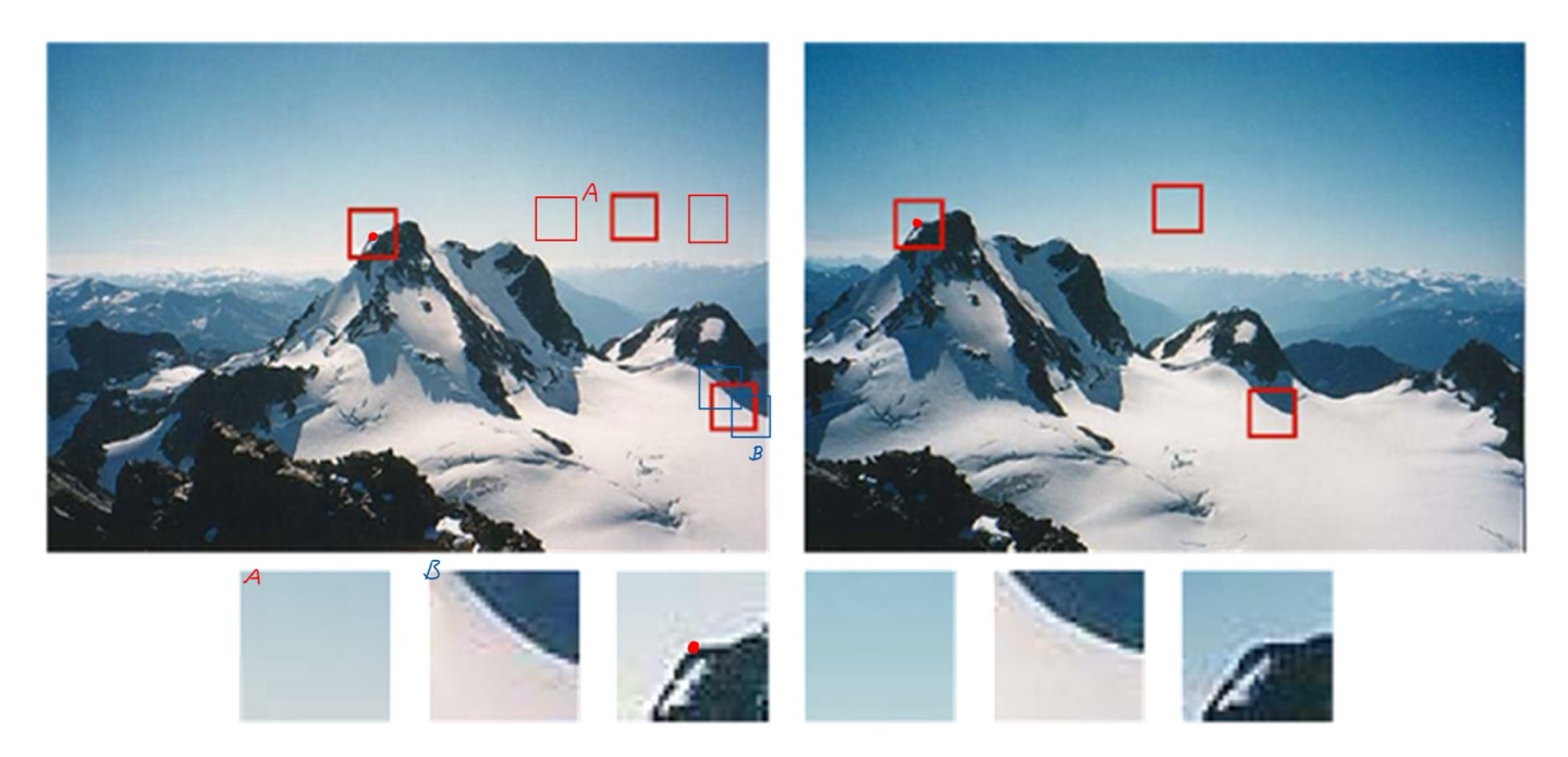 Local Feature를 찾기 위해서는, 어떤 Patch(Window)가 Unique한지 살펴봐야 한다. A Patch의 경우 빨간색 Patch로 그린 것 처럼, 인접 영역과 구분되지 않는다. 즉, 같은 색상 분포를 가지는 Patch를 생성할 수 있다. B Patch의 경우 경계에 대한 정보(Bounding Info, Edge)가 주어졌다. 하지만, 유사한 Boundary를 가지는 Patch를 생성할 수 있기 때문에 Unique하지 않다. 반면, C Patch의 경우 밝기가 2방향 이상 변하는 Corner를 포함하고 있다. C Patch와 동일한 Patch를 영상 내부에서 찾을 수 없다. 즉, Unique한 Local Feature가 된다.