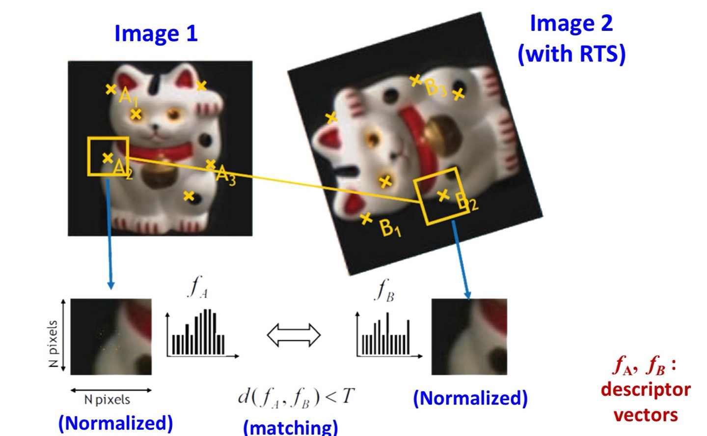 먼저 영상에서 Feature를 추출하는데, 이때 Feature를 포함하는 Patch를 추출한다(Feature Detection). Feature를 포함하는 Patch는 Normalization을 통해 Feature와 Feature 인접 영역의 픽셀 분포($f_A$)로 표현된다. 이때, $f_A$는 Patch 내부 정보를 벡터화한 일종의 Descriptor Vector이다.