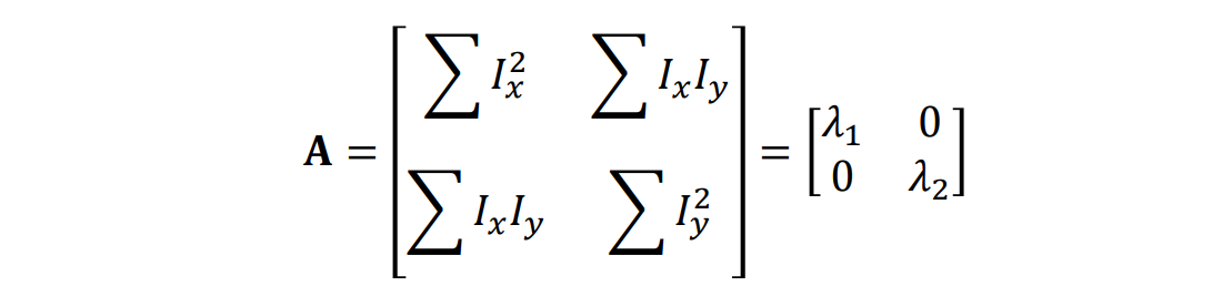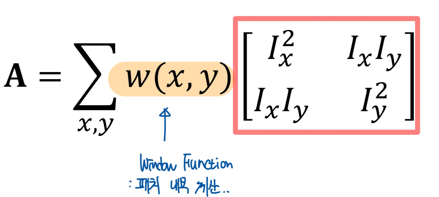 이때, $A$ Matrix는 아래와 같이 표현되는데, Patch 내부만 계산한다는 Window Function과 $I_x, I_y$를 원소로 하는 Matrix로 표현된다.