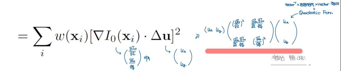 $I$는 앞서 말한 것 처럼 Intensity를 의미한다. 따라서 $(x+u, y+v)$ 위치에서의 Intensity는 $(x,y)$에서의 Intensity, x 방향으로의 기울기($\frac{\partial I}{\partial x}$)와 u의 곱, y방향으로의 기울기 ($\frac{\partial I}{\partial y}$)와 v의 곱의 합으로 근사할 수 있다. 이때, $u,v$는 $\Delta u$ 즉, Patch를 이동시킬 변화량을 의미한다. 그리고 해당 근사치를 Matrix의 곱으로 표현하면 위와 같이 표현 가능하다. 그렇구나~ 하고 넘어가자.