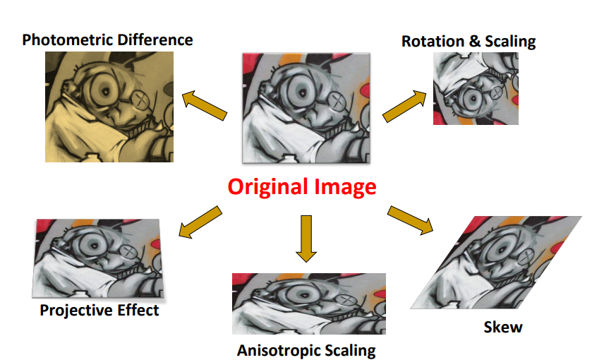 Feature Detection, Description, Matching 과정에 쉬워 보이지만 다양한 방해 요소들이 존재한다. 특히, 원본 영상에서의 조명, 회전, 크기, 시점 변화, 왜곡 등 다양한 변환 과정은 동일한 Feature에 대하여 서로 다른 Feature Descriptor를 생성하기 때문에 Matching에 큰 영향을 준다.