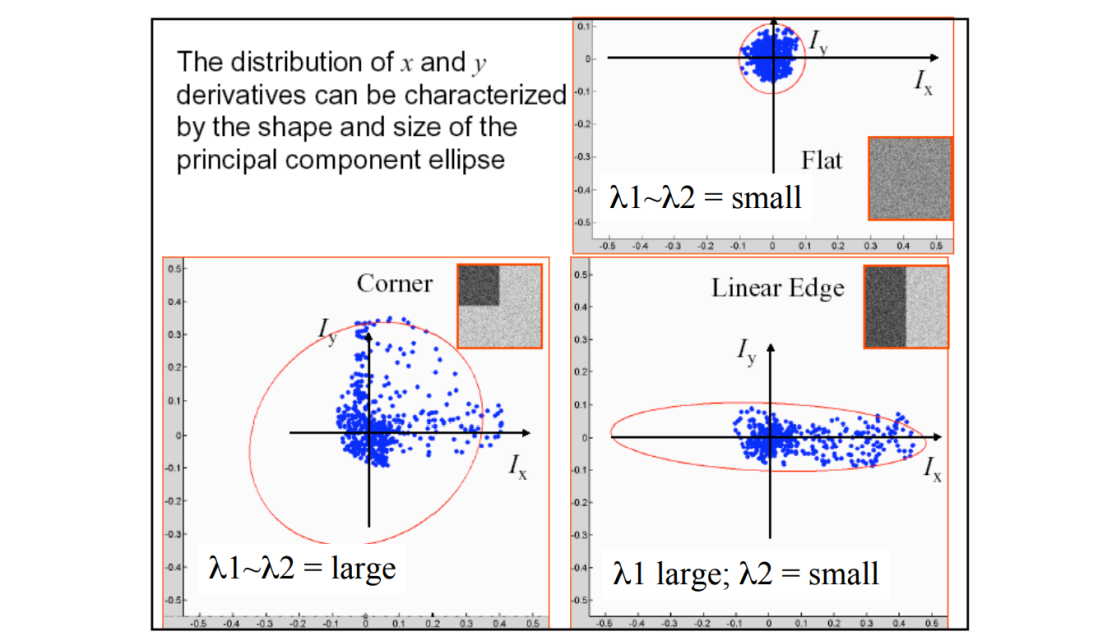$A$ Matrix는 $I_x, I_y$로 표현되며, Eigen Value로는 오른쪽과 같이 표현된다. 위 관계를 고려하여 위 분포도를 다시한번 살펴 보자.