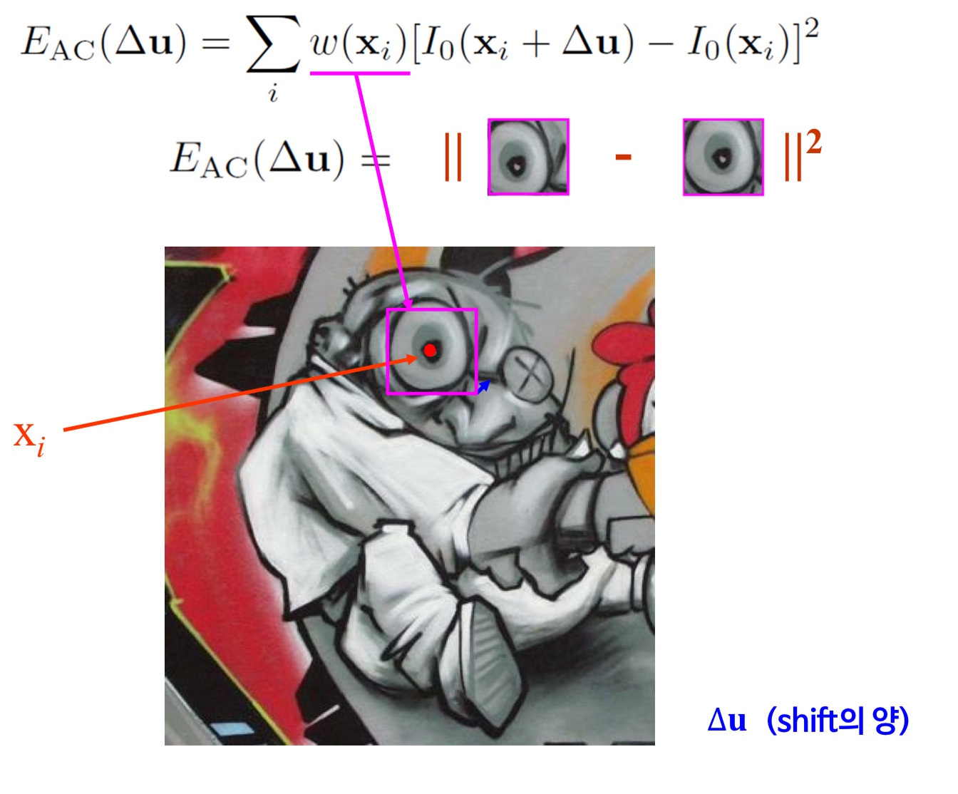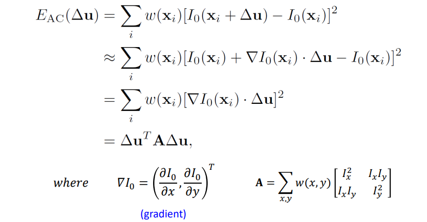 여기서 $\Delta u$는 Patch의 이동 Vector, $I$는 Intensity, $w(x_i)$는 Window Function으로 Patch 영역 내부를 의미한다. $x_i$는 특징점이라고 추정되는 좌표임을 고려하여 위 수식을 해석 해 보면, 특징점으로 추정되는 위치($x_i$)와, 해당 위치의 인접 픽셀로 이동한 위치($x_i + \Delta u$)에서의 Intensity Difference의 제곱을 계산한 것이 $E_{AC}(\Delta u)$이다.